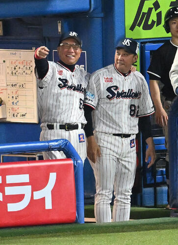 ヤクルト対阪神 2回裏ヤクルト1死二、三塁、2点適時打を放った内山壮真を指さし喜ぶ池山隆寛監督(左)(撮影・滝沢徹郎)<ヤクルト−阪神>◇28日◇神宮