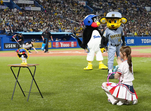 今季の本拠地開幕戦の3月31日の広島戦(神宮)で活動を再開したつば九郎。その後、イニング間に“ゲーム”に挑戦したのは初めてだった。