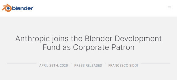 米Anthropicは4月28日(現地時間)、「Claude」をクリエイティブアプリと連携させるための各種コネクタをリリースするとともに、オープンソースの3D制作ツール「Blender」の開発基金(Blender Development Fund)に「Corporate Patron」として参加したと発表した。