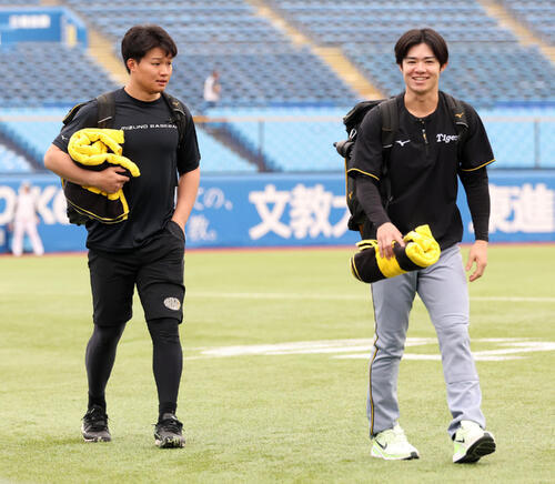 ヤクルト対阪神 談笑しながらグラウンド入りする阪神森下翔太(左)と中野拓夢(撮影・浅見桂子)<ヤクルト−阪神>◇29日◇神宮
