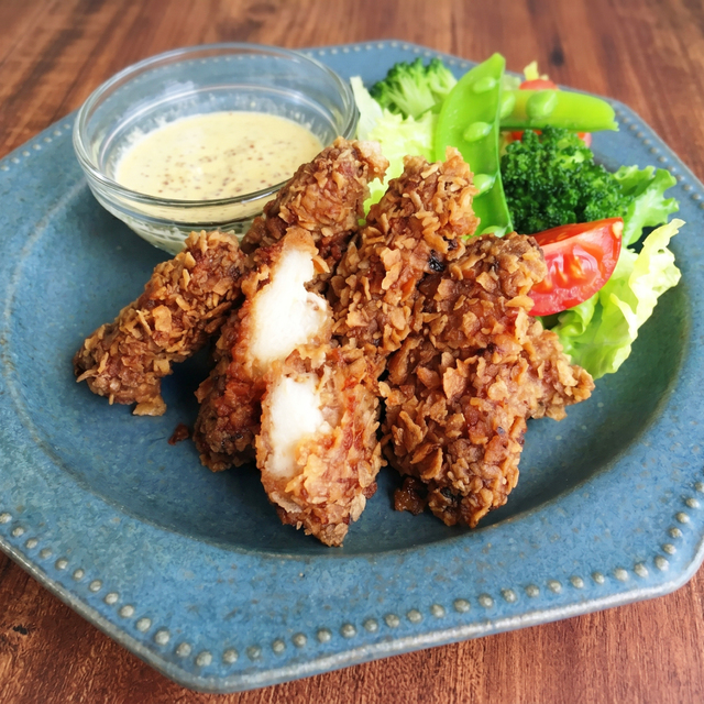鶏肉は食べやすい大きさに切り、醤油やみりんなどを揉み込み下味を付けておきます。ここに砕いたシリアルを付けて、オーブンで焼けばできあがり。揚げ油の準備や片付けも不要で手軽ですよ。ハニーマスタードソースは、はちみつ、マスタード、マヨネーズなどを混ぜるだけ。ザクザクチキンにハニーマスタードを付けて食べれば、大人も子どもも大満足できるメインおかずに!