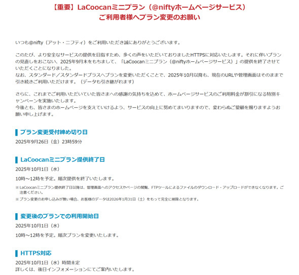 ニフティは、個人向けWebサイトホスティングサービス「LaCoocan」(ラクーカン)を10月1日からHTTPSに対応させる。httpとhttpsのどちらでもアクセス可能な併用期間(2026年6月末まで)の後、従来の「http://」へのアクセスは、自動的に「https://」のページにリダイレクトする。