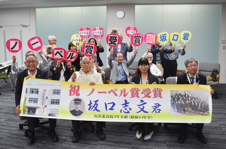 坂口志文・大阪大栄誉教授のノーベル生理学・医学賞の受賞が決まり、喜ぶ兄の偉作さん(前列左から2人目)ら=6日午後、滋賀県長浜市 ノーベル生理学・医学賞の受賞が決まった坂口志文・大阪大栄誉教授(74)の出身地、滋賀県長浜市では6日午後、パブリックビューイング(PV)が行われ、家族や同級生らから祝福と喜びの声が上がった。