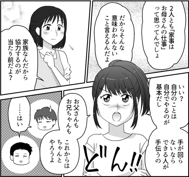 私はミズキ。家族は夫ヒロヤと、大学3年生の息子トオル、そして高校2年生の娘ハナミです。ある日私が仕事から帰ると、トオルが部屋に友だちを招いていました。そのもてなし方をめぐって、私はトオルや夫から責められます。母親ならなんでもしてあげなきゃいけないのでしょうか? そのときハナミが話に割って入ってきました。そしてトオルには「お子ちゃま気分で甘えすぎ」、夫には「親としてやってあげろと言うなら自分がすべき」と次々正論をぶつけたのです。
