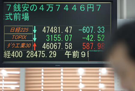 前週末比600円超安で取引が始まった日経平均株価を示すモニター=14日午前、東京都中央区 14日の東京株式市場は、公明党の連立政権離脱を受けた国内政治の不透明感の高まりが投資家心理を冷やし、売りが先行。日経平均株価の午前の終値は568円23銭安の4万7520円57銭だった。午後の取引では、下落幅が一時1400円を超えた。