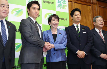 衆院本会議で首相に指名され、あいさつ回りで日本維新の会の吉村洋文代表(左から2人目)と握手する自民党の高市早苗総裁(中央)=21日午後、国会内