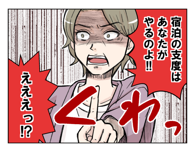 なんとサカエおばさん、ミナさんが苦労して整えた宿泊準備を、ぜんぶ自分がやったことにするつもりのようです! 義両親からの感謝の言葉をすべて、自分だけが受け取るつもりなのでしょうか。サカエおばさんの話しぶりからすると、「ミナさんが頑張ってくれたのよ」と言う気はまったくなさそうですね。ズルいというか、セコいというか……。その人間性に、思わず言葉を失います。
