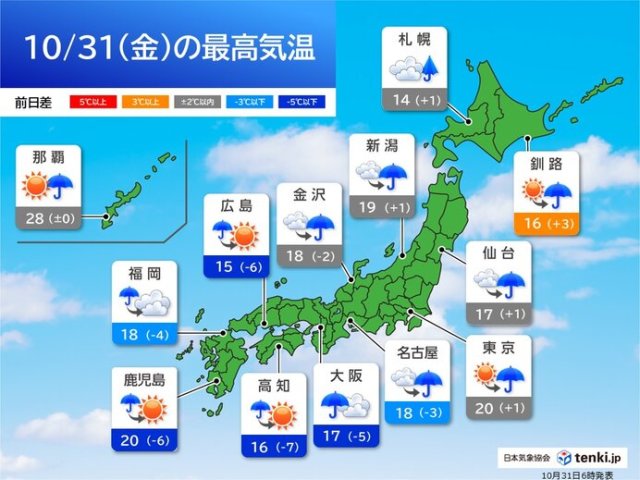 今日10月31日のハロウィンは、全国的に曇りや雨で、暖かい服装と傘が必須の一日になりそうです。最高気温は関東から九州は平年並みか平年より低いでしょう。20℃に届かない所が多い見込みです。ジャケットなど羽織ってお出かけください。