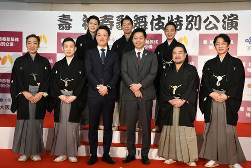 大阪国際文化芸術プロジェクト「壽 初春歌舞伎特別公演」(26年1月7〜25日、大阪松竹座)の記者発表会が10日、大阪市内で行われ、歌舞伎俳優中村鴈治郎(66)、片岡孝太郎(57)、片岡愛之助(53)、市川中車(59)、中村壱太郎(35)、中村種之助(32)、中村歌之助(24)、吉村洋文大阪府知事(50)、横山英幸大阪市長(44)が出席した。