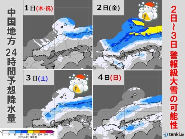 雪のピークは2日(金)午後から3日(土)午前となる見通しです。2日(金)は日本海に風の収束帯が形成され、発達した雪雲が山陰に向かって次々と流れ込む恐れがあります。雪雲の発達の程度によっては、2日(金)と3日(土)は山陰で警報級の大雪となる可能性があるため、今後の情報にご注意ください。