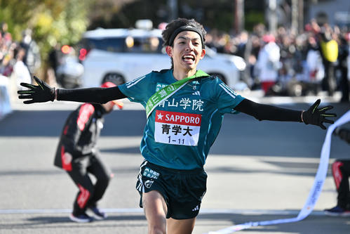 「もう全然(レース中は)記録更新とか考えてなくて、終わって初めて、区間新だったところもそうですし胸を張って『山の神だ』と言える記録だったことを知りました。(名前は事前に決めていたのか?)はい。走る前に(原晋)監督と話して、もう何代目とかじゃなくて、これはシン・山の神だなという話をしていました。『新』しいという意味もありますし『真の』山の神という意味もあると思いますし、どう表記されるのかは分かんないんですけど(笑い)。たぶん、いろいろな意味が込められてくると思います」