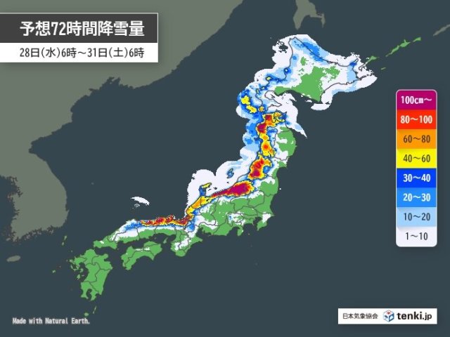 今日28日は、日本付近が次第に冬型の気圧配置になり、日本海側を中心に雪が降り、ふぶく所もありそうです。29日から30日にかけても雪が続き、積雪の増加や路面悪化による交通への影響に注意が必要です。一方、太平洋側はおおむね晴れるものの、山沿いでは雪や雨の降る所も。最高気温は全国的に平年並みか低く、厳しい寒さが続くでしょう。空気の乾燥にもご注意ください。