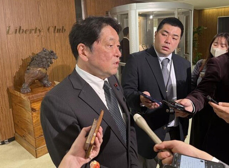 自民党安全保障調査会の幹部会合後に、記者団の取材に応じる小野寺五典会長=24日午後、東京・永田町の同党本部