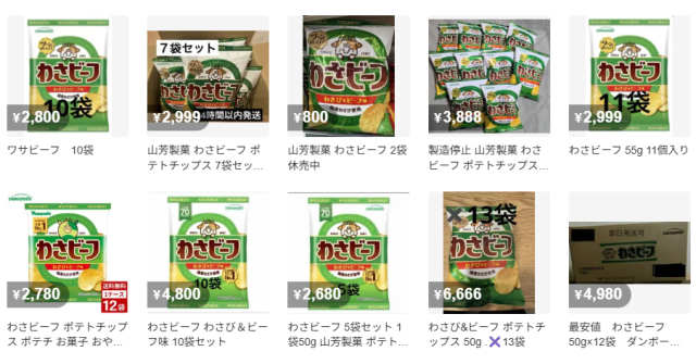 出荷停止が発表されたポテトチップス「わさビーフ」が、フリマサイトで相次いで出品されている。3月18日時点では、50g/1袋の標準小売価格が160円なのに対して、メルカリでは「品薄」「貴重」「休売中」などの売り文句とともに、3袋で1555円や10袋で3888円などの高額で出品されている。