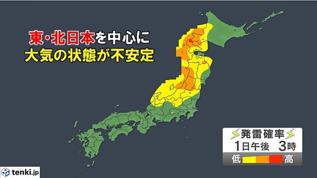 今日1日は、北日本の上空約5500メートルにー15℃以下、東日本・西日本にはー12℃以下と、この時期としては強い寒気が流れ込むでしょう。大気の状態が不安定になるため、午後ほど雷が発生する確率が高くなっています。落雷や竜巻などの激しい突風、ひょうが降るおそれがあり、注意が必要です。