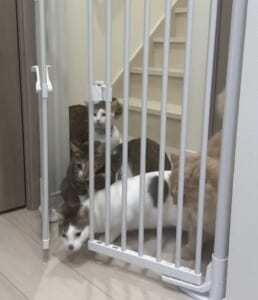 突破劇が起こる前の様子をうかがってみると、最初ゲートの前にいたのは1〜2匹の猫ちゃんたち。飼い主さんが何気なくかまっていると、それを察したほかの猫ちゃんが「僕も」「私も」と次々に集結。動画のようなわちゃわちゃ状態になってしまったようです。