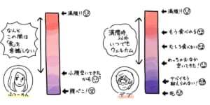 イラストでは「デブ」の場合、満腹以外の状態なら常に「食べたい」「もう食べられる」と食欲センサーが発動中。一方で「フツーの人」は「小腹が空いた」「腹ぺこ」といった一部のタイミングでしか“食”を意識していません。