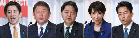 自民党総裁選に出馬した候補者。(写真左から)小林鷹之氏、茂木敏充氏、林芳正氏、高市早苗氏、小泉進次郎氏 石破茂首相の後継を決める自民党総裁選は4日、党所属国会議員の投票が行われ、党員・党友票と合わせて開票される。候補者5人のうち、先行する小泉進次郎農林水産相(44)を高市早苗前経済安全保障担当相(64)、林芳正官房長官(64)が追い上げ、3氏の激戦になっている。1回目の投票では過半数を得る候補は出ず、上位2人の決選投票による決着が確実だ。