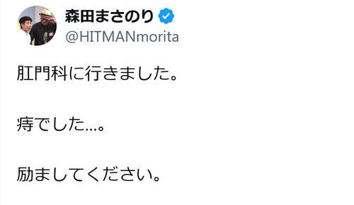森田氏は7日の投稿で「お尻を拭いたら血がついたので、痔では!?と思ってボラギノールを買った。指に軟膏をつけて肛門に塗るのは何か勇気いるな!あと当たり前ですが、ノールックで一発で肛門に指を当てるのはなかなか難しい。コツを教えてください」とつづっていた。そして10日午後「肛門科に行きました。痔でした…」と打ち明けた上で「励ましてください」とフォロワーに投げかけていた。