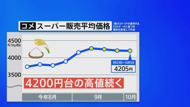 コメの平均価格は4週連続で5キロ4200円台の高値が続いています。
