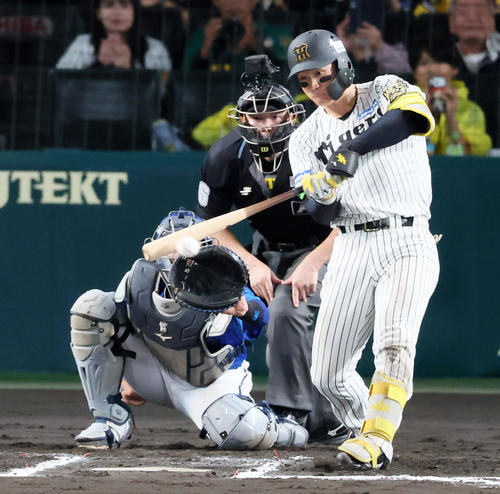 阪神の反撃は8回だった。先頭の近本が四球で出塁し、中野が犠打を決めて1死二塁。続く森下も四球を選び1死一、二塁とすると、4番佐藤輝がDeNA伊勢の初球のフォークをはじき返し、同点の右前適時打を放った。
