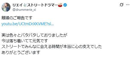 X JAPANのYOSHIKIにXアカウントをフォローされたことで話題になった女性ストリートドラマーのリエイさんが17日までにYouTubeチャンネルを更新。離婚を報告した。