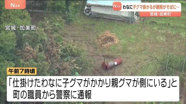 宮城県加美町では、きょう午前7時ごろ、藪のなかで「仕掛けたわなに子グマがかかり、親グマが側にいる」と町の職員から警察に通報がありました。