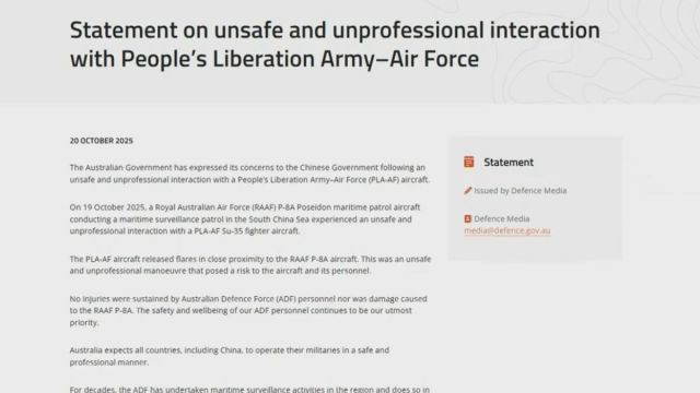 一方、中国軍南部戦区の空軍報道官は20日、「オーストラリアのP-8A哨戒機1機が中国政府の許可を得ずに領空に不法侵入したため、法に基づいて追跡・監視し、警告して退去を命じた」と発表しました。