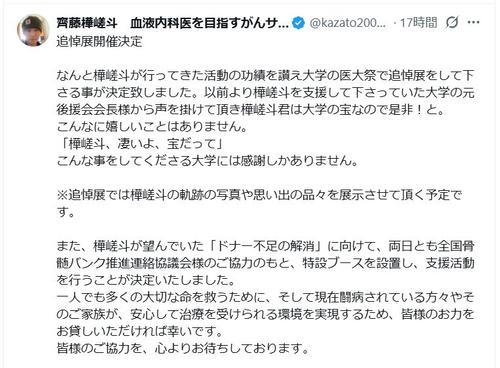 ¡Ö·ì±ÕÆâ²Ê°å¤òÌܻؤ¹¤¬¤ó¥µ¥Ð¥¤¥Ð¡¼¡×¤È¤·¤ÆÆ®É¤ˤĤ¤¤ÆÈ¯¿®¤·¡¢9·î16Æü¤ËË´¤¯¤Ê¤Ã¤¿óîÆ£³òº·Åͤµ¤ó¤ÎÄÉÅ韤¬³«ºÅ¤µ¤ì¤ë¤³¤È¤¬·èÄꤷ¤¿¤È¡¢óîÆ£¤µ¤ó¤Î²È²¤¬22Æü¤Þ¤Ç¤ËX¡Êµì¥Ä¥¤¥Ã¥¿¡¼¡Ë¤ÇÊó¹ð¤·¤¿¡£