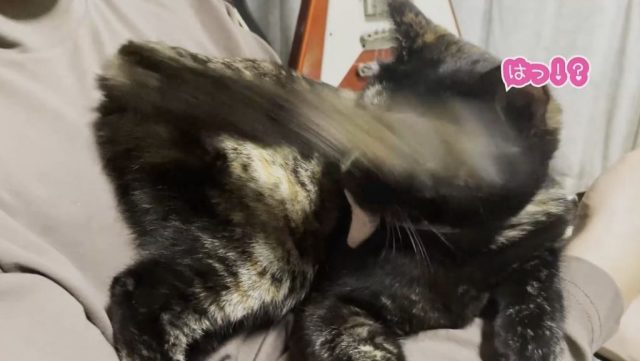 「は⁉」とばかりに振り向いた瞬間も、すかさず顔へとお見舞いされるいーちゃん。猫ちゃんのシッポの動き、本人にもコントロールできないのですね。