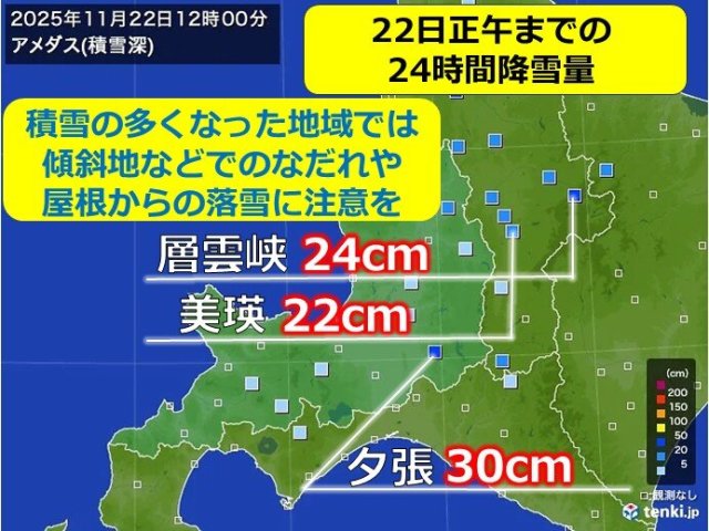 昨日(21日)から今日(22日)にかけて北海道付近は冬型の気圧配置となり、西よりの強い風を伴ってふぶいた所もありました。また、道北や道央など日本海側の内陸などでは局地的に雪の降り方が強まり、今日正午までの24時間降雪量は、空知地方の夕張で30センチ達し、その他、上川地方の層雲峡で24センチ、美瑛では22センチを観測しました。