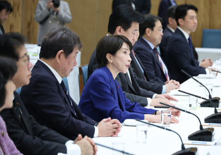 政府・与党連絡会議で発言する高市早苗首相(左から4人目)=1日午後、首相官邸