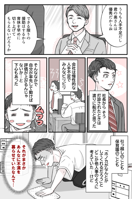俺が安請け合いしてきた話だったのに、なぜか全て「ホノカがやって当然だ」と思ってた。「まだ決まってないの?」なんて口を出したときもあったな。「早く決めないと、保育園行けないよ?」なんて文句を言ったことも。「なるべく家賃が安いところにしろよ」とも言った……。今思えば、俺はいつも自分の都合ばかりを優先していた。