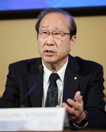 スウェーデン王立科学アカデミーで記者会見する京都大の北川進特別教授=7日、ストックホルム 【ストックホルム時事】今年のノーベル化学賞を受賞する京都大の北川進特別教授(74)が7日午前(日本時間同日夕)、ストックホルムのスウェーデン王立科学アカデミーで公式記者会見した。北川さんは「基礎研究が成果を挙げ、活用されるには25年ほどかかる」とした上で、長期にわたる資金的支援が必要との認識を示した。