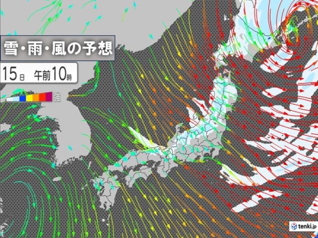 今日15日は、北海道と東北は午前を中心に荒れた天気で、大雪や暴風雪も。関東から西では太平洋側ほど広く晴れるが、冷たい北よりの風が強めに吹く。