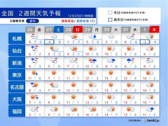 年末年始の天気と気温の予想です。26日(金)は今季最強レベルの寒気の影響で、冬の嵐となるでしょう。北海道や本州の日本海側は暴風や暴風雪、大雪による交通障害に警戒。東海や近畿など太平洋側にも雪雲の流れ込む所があるでしょう。2026年1月1日(木)は西から天気が下り坂ですが、関東などでは晴れて、初日の出を拝めそうです。2日(金)は雨エリアが広がるでしょう。