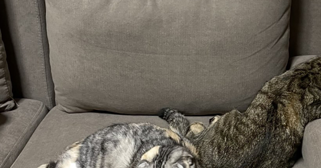 今回話題になっているのは、ソファの上で並んでくつろぐ2匹の姿。左にいるサラちゃんは前足も後ろ足ものびのびと伸ばし、リラックスした体勢でゆったりと過ごしています。