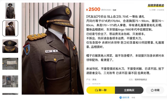約5万2000円で売られていたのは、金糸の肩飾りが威厳を醸し出すジャケット。左胸部分に記念章や功労章が連なっている。これは、陸上自衛隊の一佐の常装服だという。