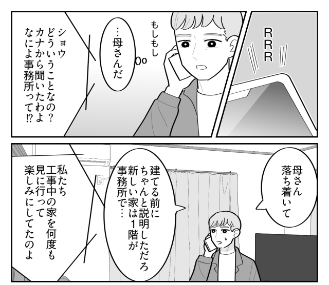 新生活への期待が一変、とんでもないことになってしまいました。義両親はなんとしてでも私たちの新居に住みたいようです。二世帯住宅じゃないと言ったら、私たち家族を押しのけてまで住むと言い出しました。このままでは無理やり勝手に引っ越して来てしまうかもしれません……。どうしてこんな勘違いを引き起こしてしまったのでしょう。ショウは頭を抱えていました。