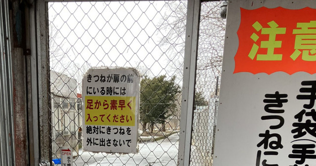 飼育エリアの扉には、ある注意書きが貼ってありました。それは「きつねが扉の前にいる時には『足から素早く入ってください』絶対にきつねを外に出さないで」というものです。手袋や手荷物を奪われないように、という注意看板も設置されていました。飼育下でものびのびと暮らし、野生みのあるキツネたち。これはしっかり注意しながら牧場へ入らなければなりません。