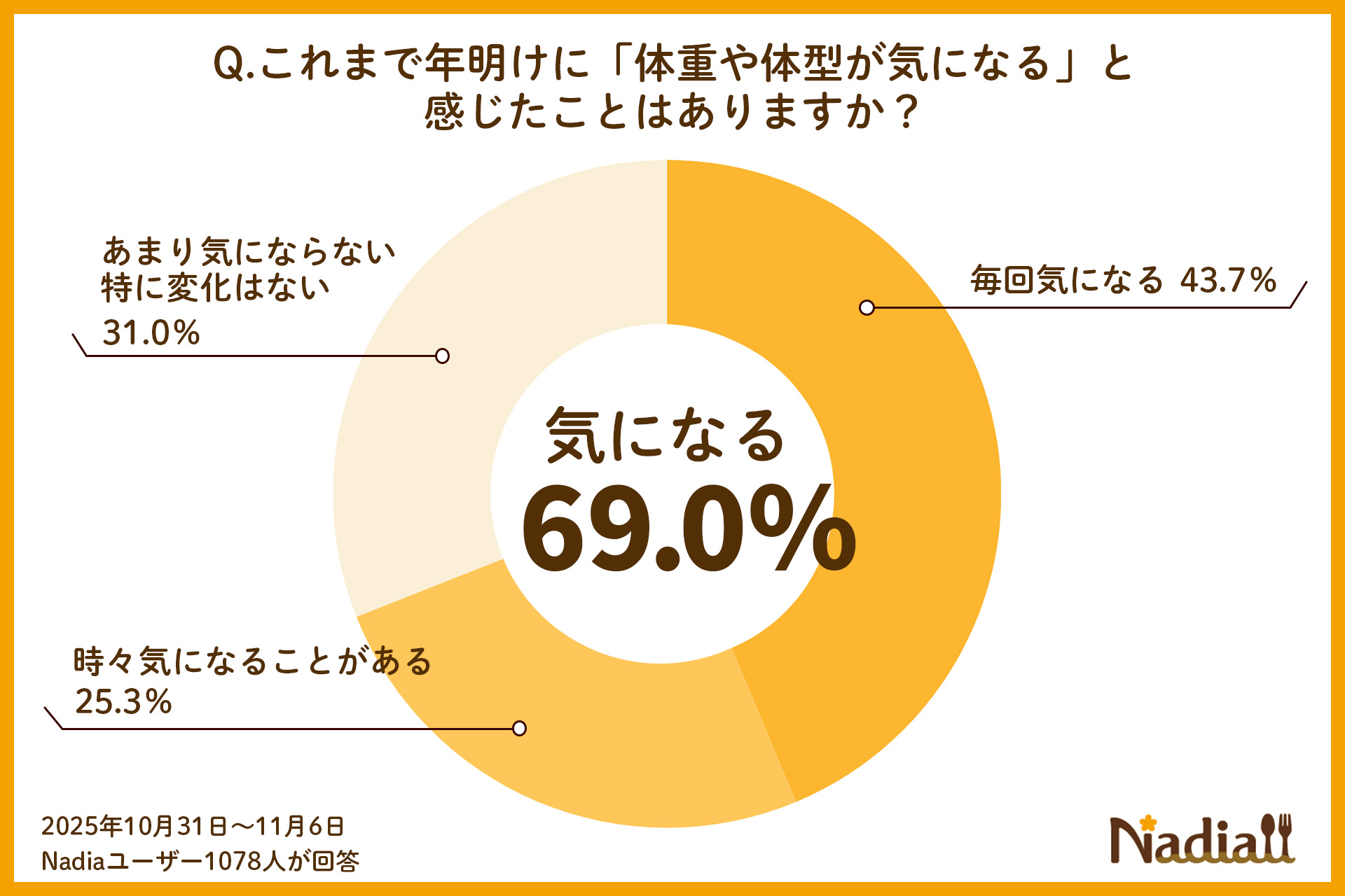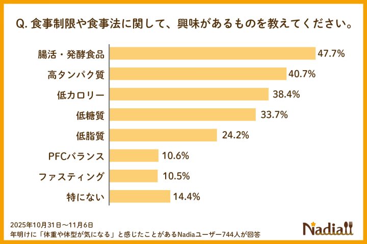 調査は、2025年10月31日〜11月6日にNadiaユーザーにメールマガジンで実施、1078人が回答した。年明けに「体重や体型が気になる」と感じたことがある人は69%にのぼり、多くの人が正月太りの経験あり。これを解消するために行うこととして最も多かったのは「食事制限・食生活の見直し」(46.4%)、次いで「運動」(42.1%)だ。興味がある食事制限・食事法について聞いたところ、1位は「腸活・発酵食品」、2位は「高タンパク質」。最近のトレンドとして、低カロリー・低糖質・低脂質といった「制限系」の食事法よりも、腸活・発酵食品のような「体に良いものを取り入れて整える」「腸内環境や栄養バランスを重視する」ことに関心が集まっていると分析されている。