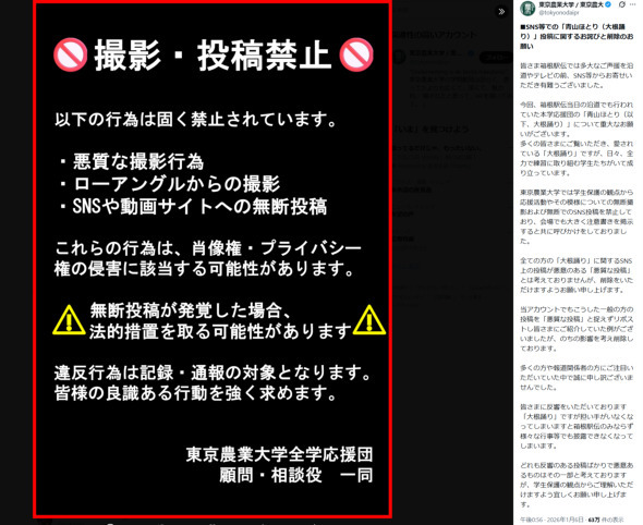 東京農業大学は1月6日、箱根駅伝で2日、応援団の学生が披露した「青山ほとり」(通称:大根踊り)について、無断で撮影したりSNSに投稿した人に対して、削除するよう呼びかける声明を、公式Xで発表した。