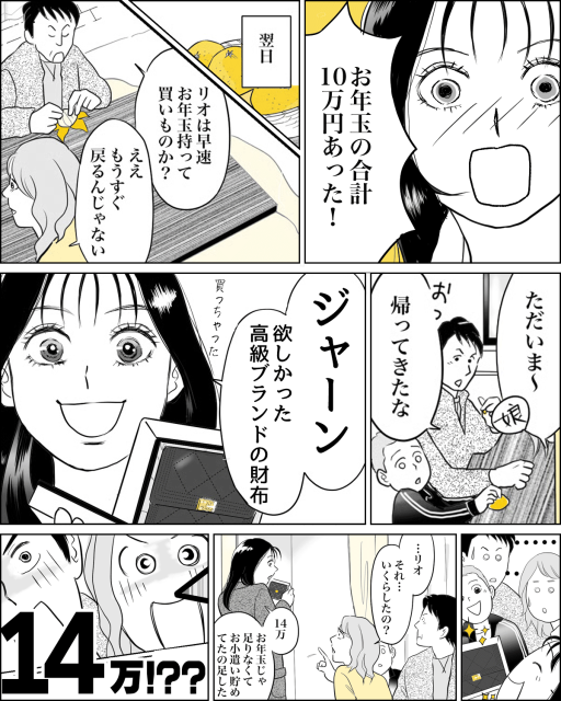 買い物から帰ったリオの手には、総額14万円もする高級ブランド財布が。これにはパパもママもビックリ。お年玉10万円に自分で貯めた4万円を足して購入したと話すリオ。いくら自分のお金だからとはいえ、高校生に高級ブランドの財布はいかがなものか……。しかし娘にも娘なりの言い分があるのかもしれません。今後高価なものを買うときは、事前に相談するなどと決めておいたほうがいいかもしれませんね。