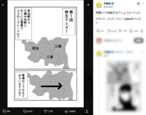 SEとして働きながら、Xに漫画を投稿している「千葉零」さんが投稿した埼玉県に関するクイズが「ホントに埼玉は電車での横移動が大変……」「埼玉あるあるですな」などと注目を集めています。