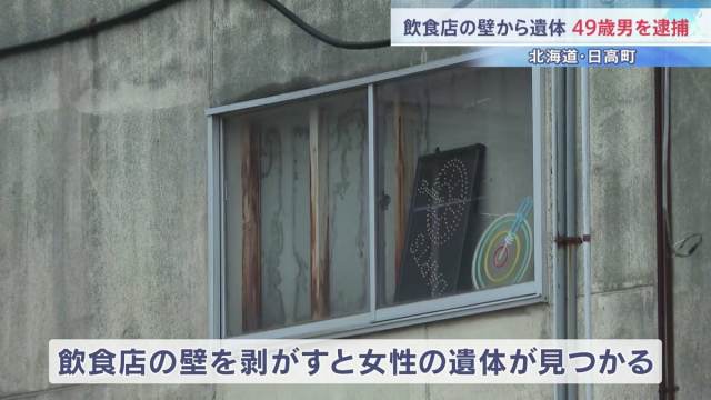きょう未明、北海道日高町の飲食店の壁の内側から成人女性の遺体が見つかり、警察はこの店を経営する49歳の男を死体遺棄の疑いで逮捕しました。
