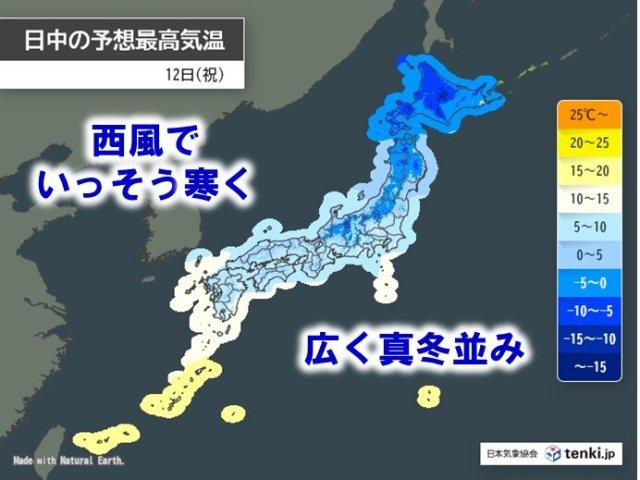 今日12日(月:成人の日)は、上空1500メートル付近でマイナス6℃以下・平地で雪が降る目安の寒気にすっぽりと覆われるでしょう。夜になると前線を伴った低気圧が日本海に進んでくるため、寒気は次第に北上するものの、全国的に真冬のような寒さになりそうです。