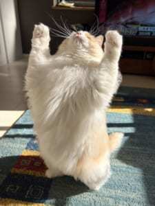 意図してバリアを張っているというよりは、飛び上がっている瞬間のポーズがバリアを張っているように見えるという1枚。ほかの猫ちゃんやワンちゃんでも、同じように後ろ足で立ち上がる仕草をする子はよく見かけます。