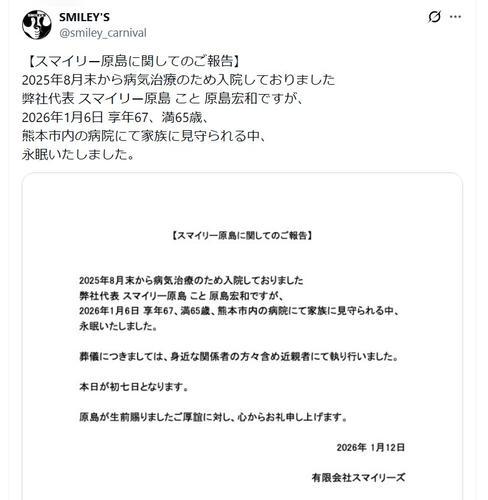 ¡ÖSMILEY¡ÇS¡×¸ø¼°¥¤¥ó¥¹¥¿¥°¥é¥à¤Ï¡Ö͸²ñ¼Ò¥¹¥Þ¥¤¥ê¡¼¥º¡×̾µÁ¤Ç¡Ö¥¹¥Þ¥¤¥ê¡¼¸¶Åç¤Ë´Ø¤·¤Æ¤Î¤´Êó¹ð¡×¤ÈÂꤷ¡¢¡Ö2025ǯ8·îËö¤«¤éɵ¤¼£ÎŤΤ¿¤áÆþ±¡¤·¤Æ¤ª¤ê¤Þ¤·¤¿ÊÀ¼ÒÂåɽ¥¹¥Þ¥¤¥ê¡¼¸¶Å礳¤È¸¶Å繨ϤǤ¹¤¬¡¢2026ǯ1·î6Æüµýǯ67¡¢Ëþ65ºÐ¡¢·§ËÜ»ÔÆâ¤Îɱ¡¤Ë¤Æ²È²¤Ë¸«¼é¤é¤ì¤ëÃæ¡¢±Ê̲¤¤¤¿¤·¤Þ¤·¤¿¡×¤ÈÊó¹ð¤·¤¿¡£