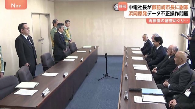 静岡県にある浜岡原発の再稼働の審査をめぐるデータ不正操作問題で、中部電力の林社長がきょう午前、地元の御前崎市役所を訪れ、市長らに謝罪しました。