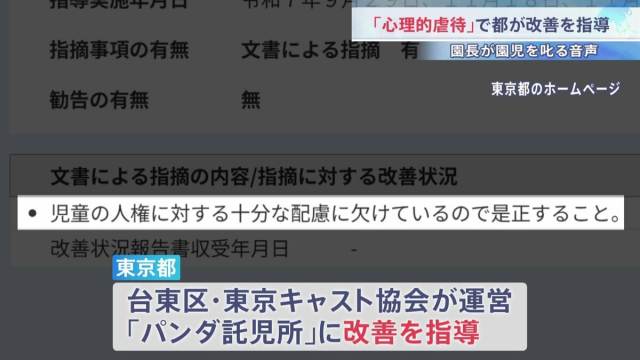 その後、関係者から園長の行為を記録した音声データが提出されたことから、都は児童福祉法に基づく特別立入調査を実施。男性園長が去年9月、泣いている園児に対し威圧的に何度も叱るなどの行為が確認されたことから、「心理的虐待に該当する」と判断したということです。